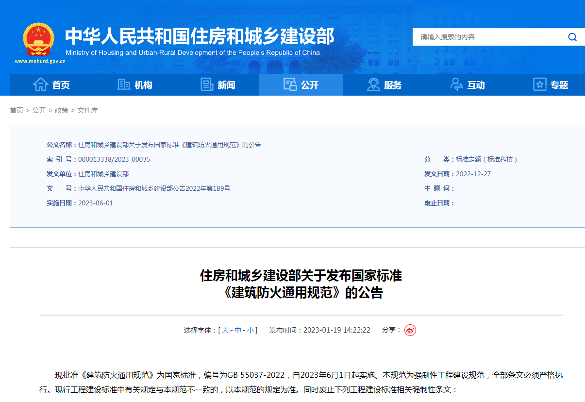 現(xiàn)批準《建筑防火通用規(guī)范》為國家標準,編號為GB 55037-2022,自2023年6月1日起實施。本規(guī)范為強制性工程建設規(guī)范,全部條文必須嚴格執(zhí)行?,F(xiàn)行工程建設標準中有關規(guī)定與本規(guī)范不一致的,以本規(guī)范的規(guī)定為準。同時廢止下列工程建設標準相關強制性條文:
