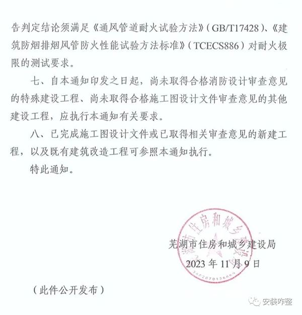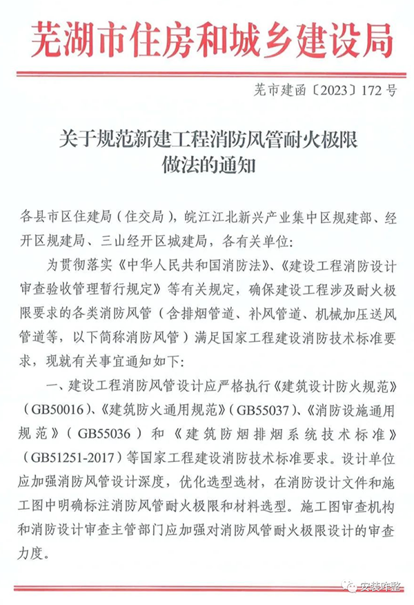 蕪市建函[2023]172號《關(guān)于規(guī)范新建工程消防風(fēng)管耐火極限做法的通知》