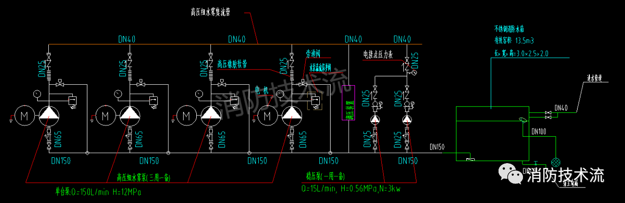 6、細水霧滅火介質采用淡水,系統(tǒng)用水量為1.5t,設置有效容積為13.5m?儲水箱,水箱材質采用不銹鋼,儲水箱的出水口高于水泵的入水口(即水箱出水口對水泵入水口保持正壓)